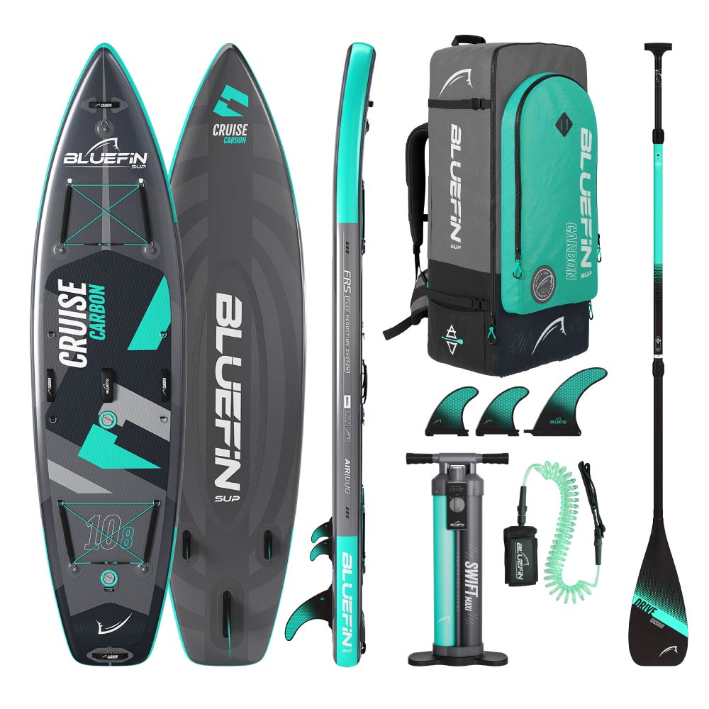 The Bluefin Cruise Carbon comes with various accessories. These include a paddle, pump, and backpack. It also includes a leash and repair kit.